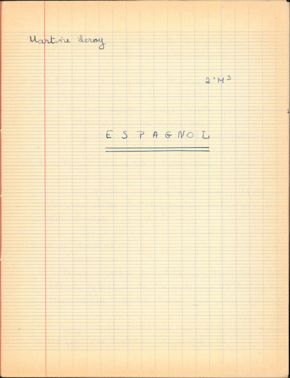 Notes : Cahier d'Espagnol de Martine Leroy-Bouveyron (née Leroy) alors âgée de 16-17 ans, élève de 2nde M 3 (Moderne) au Lycée Victor Duruy à Paris (VIIe arrondissement), durant l'année 1963-1964.