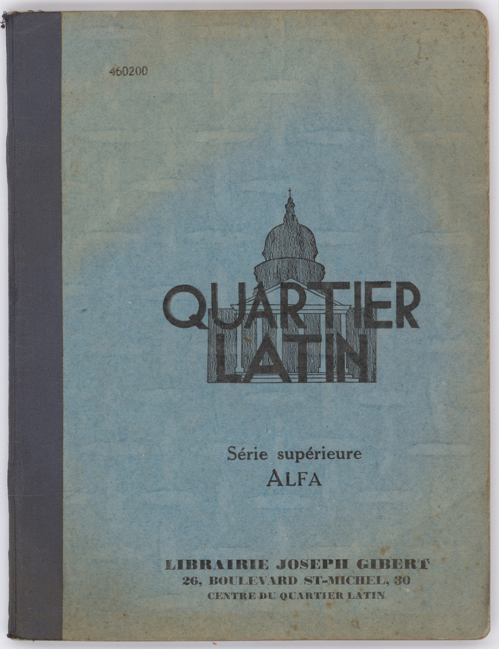 Description : Couverture cartonnée bleue. Dos toilé noir. Gardes bleues imprimées. Tranches mouchetées en bleu. Reliure cousue. Réglure à carreaux 5 x 5 mm avec marge rose. Pontuseaux verticaux et vergeures horizontales. Filigrane "Librairie Joseph Gibert au centre du Quartier Latin"