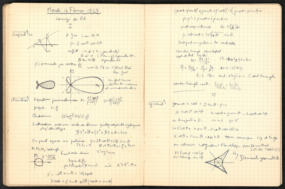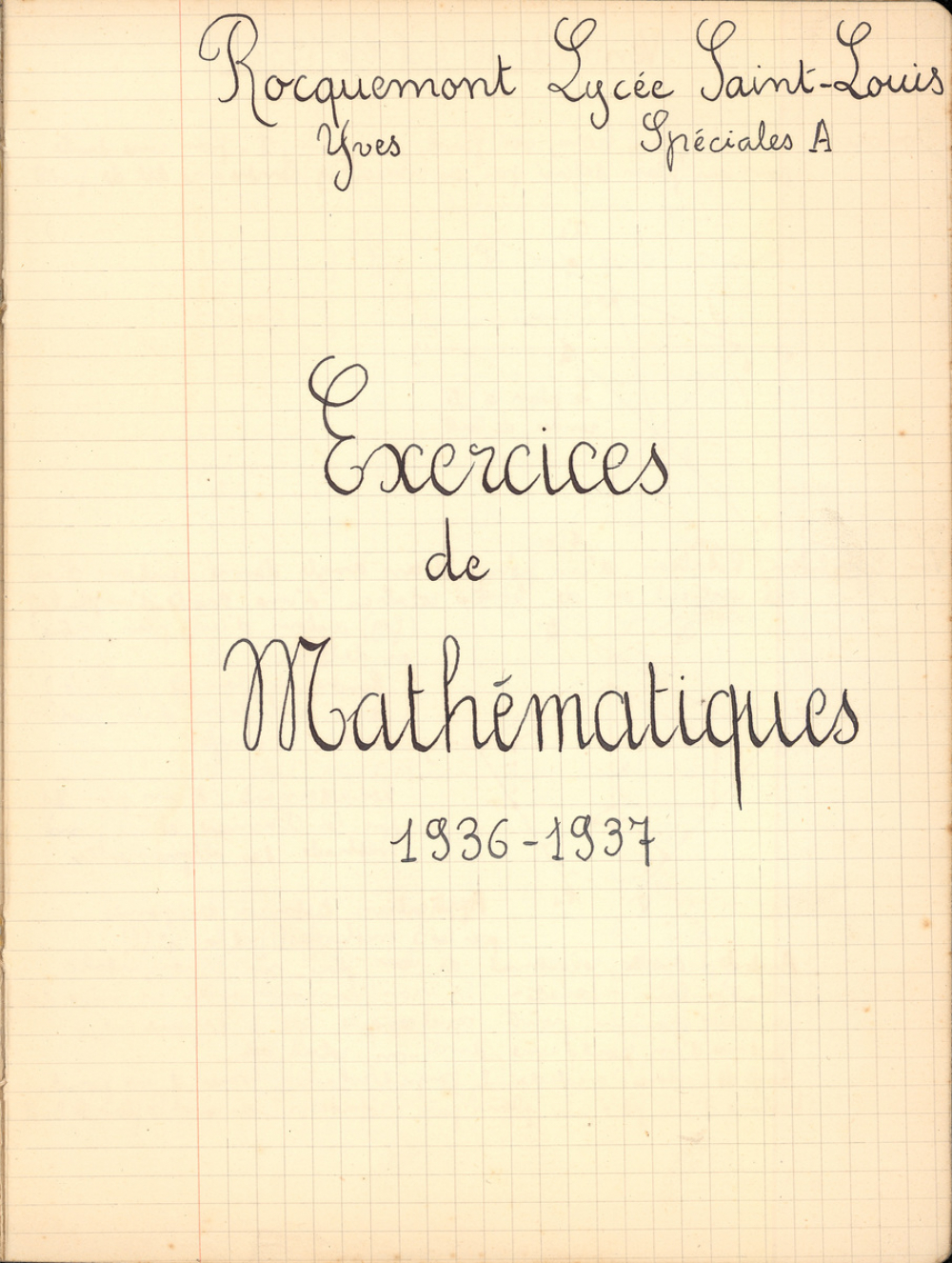Notes : Il s'agit du cahier d'exercices de mathématiques d'Yves Rocquemont, élève scolarisé en classe préparatoire de l'Ecole Polytechnique en Spéciales A dite taupe (en 5/2, redoublant de 2e année), au Lycée Saint-Louis de Paris (6e arrondissement), durant l'année 1936-1937.