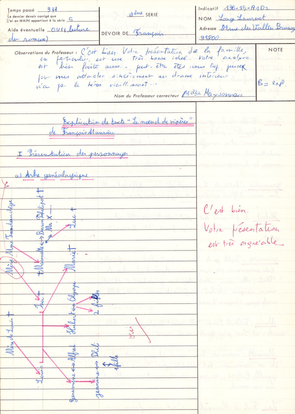 Notes : Il s'agit d'un devoir de français à envoyer, suite à un cours par correspondance au programme de 3e de l'année 1976-1977, établi par Mademoiselle Marion professeur associée du CNTE (Centre National de Télé-Enseignement, futur CNEC et désormais CNED) de Rouen, alors accueilli dans les locaux du CRDP (Centre Régional de Documentation Pédagogique, actuellement Canopé) de Mont-Saint-Aignan.