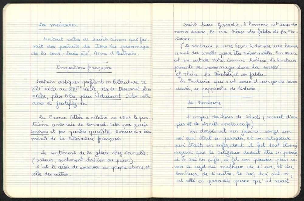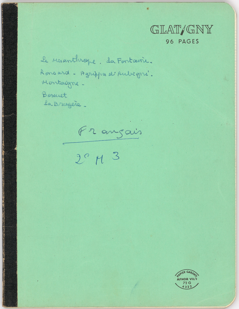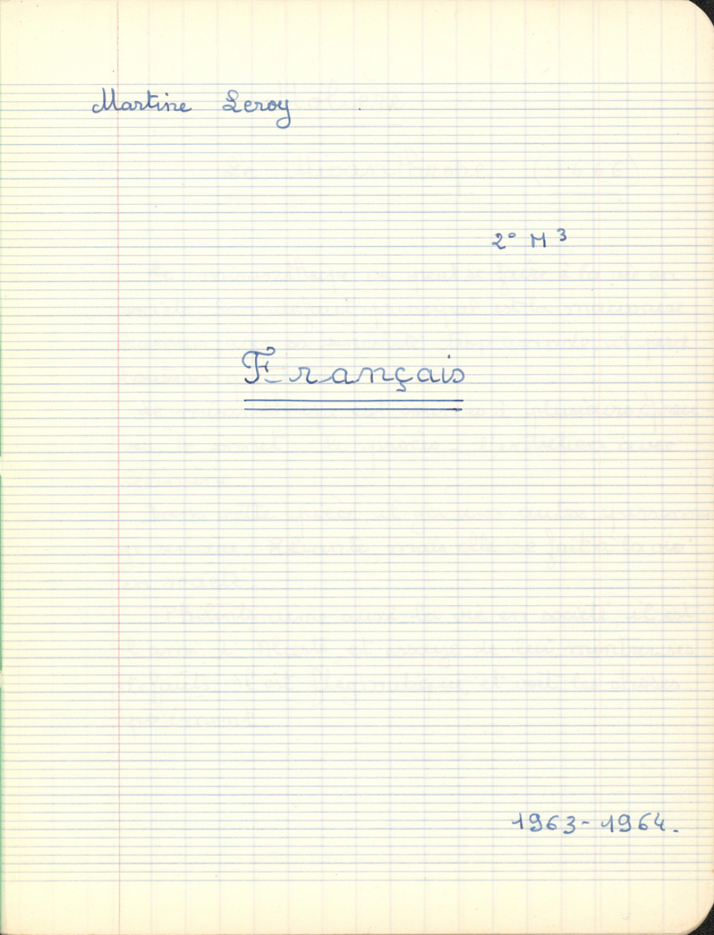 Notes : Il s'agit du cahier de Français de Martine Leroy-Bouveyron (née Leroy) alors âgée de 16 ans, élève de 2nde M3 au Lycée Victor Duruy à Paris (VIIe arrondissement), durant l'année 1963-1964.