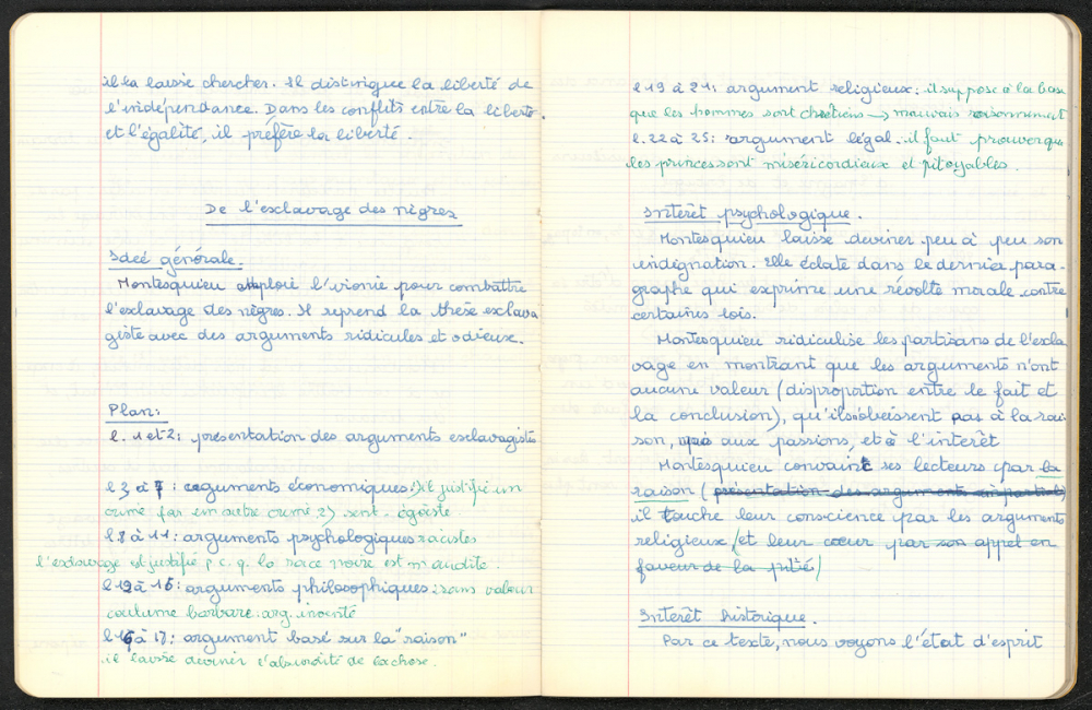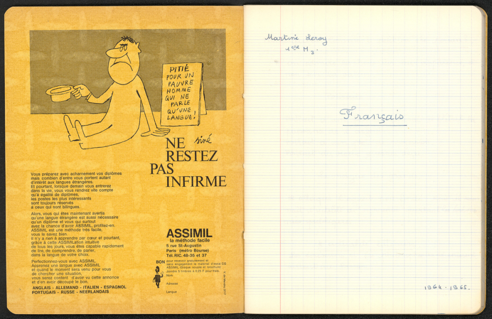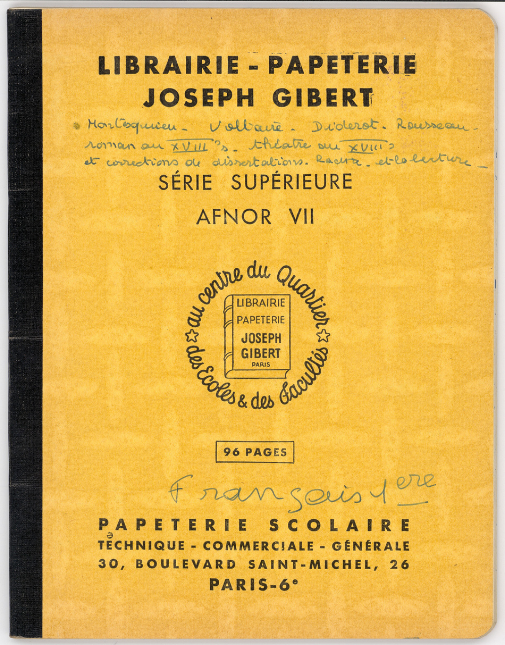 Notes : Il s'agit du cahier de Français de Martine Leroy-Bouveyron (née Leroy) alors âgée de 17 ans, élève de 1ère M3 au Lycée Victor Duruy à Paris (VIIe arrondissement), durant l'année 1964-1965.