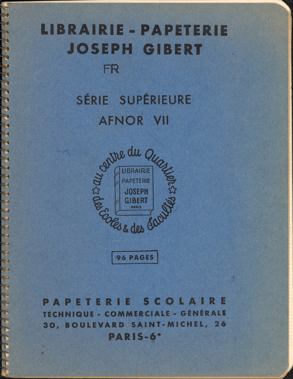Description : Couverture en papier cartonné bleu. Reliure métallique en spirales. Gardes beiges imprimées. Réglure Séyès carreaux 8 x 8 mm avec marge rose.