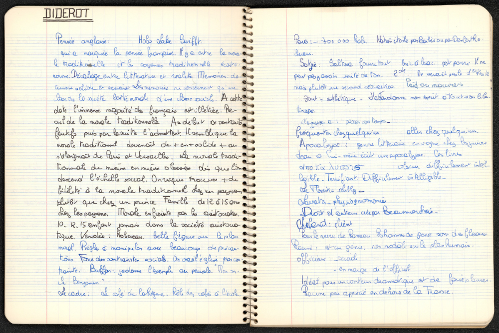Notes : Il s'agit du cahier de Français de Marie-France Rocquemont (épouse Morel), élève alors scolarisée au lycée Marie Curie de Sceaux (Hauts de Seine, ex-Seine) en classe de 1ère C, durant l'année 1957-1958.