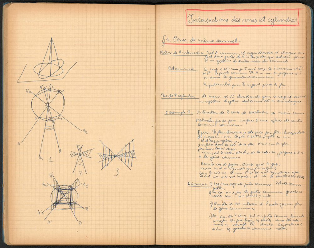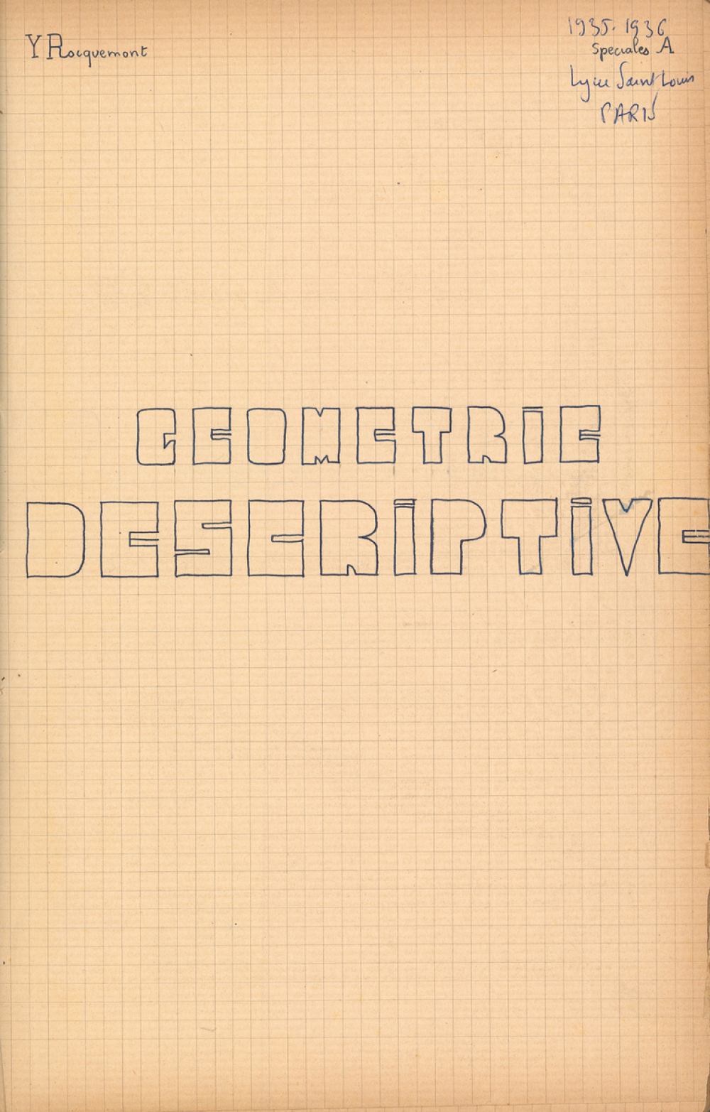 Notes : Il s'agit du cahier de Géométrie descriptive d'Yves Rocquemont, élève scolarisé en classe préparatoire de l'Ecole Polytechnique en Mathématiques spéciales A dite taupe ("3/2" ou 2e année), au Lycée Saint-Louis de Paris (6e arrondissement), durant l'année 1935-1936.