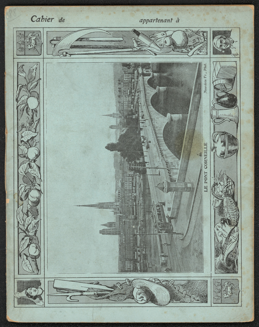 couv. ill. : Plat de devant : "Le pont Corneille" Rouen (76500), Neurdein Frères Photographie, représentant une vue du Pont Corneille et de son tramway, prise de la gare de Saint-Sever ; en arrière-plan de droite à gauche, la tour-lanterne de l'église Saint-Maclou, la tour-clocher de l'abbaye Saint-Ouen, le quai Pierre Corneille et la cathédrale Notre-Dame. Encadrement comprenant les armoiries de la ville de Rouen, une Rouennaise en coiffe traditionnelle, un Rouennais fumant une pipe coiffé d'un bonnet cauchois, des pommes, des ustensiles de pêche et de travaux agricoles, des victuailles diverses et des pichets. Plat de derrière : texte sur l'histoire et la description du pont Corneille.