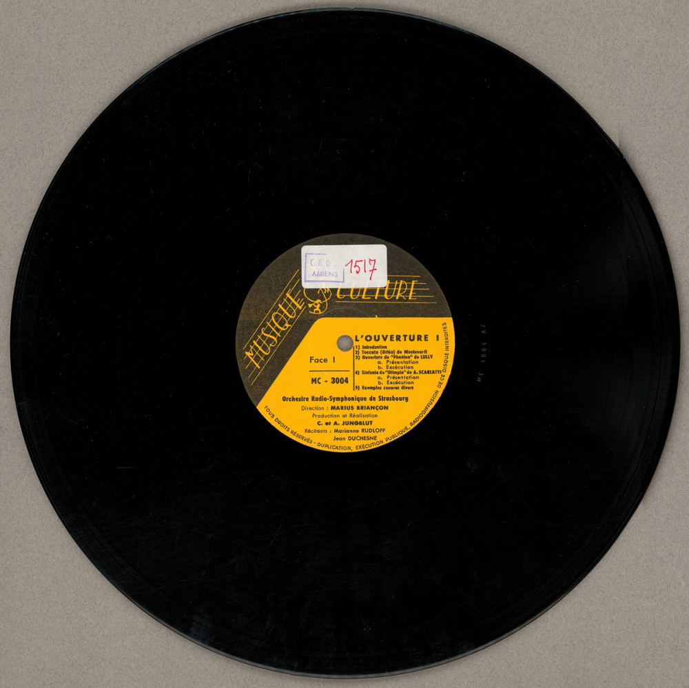 Notes : (1) Disque. Contient : Face 1 : 1) Introduction, 2) Toccata (Orféo) de Monteverdi, 3) Ouverture de "Phaéton" de Lully, 4) Sinfonia de "Olimpia" de A. Scarlatti, 5) Exemples sonores divers.
