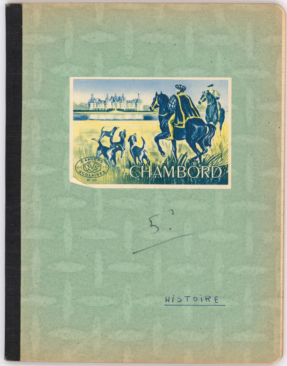 Éditeur : "Chambord" Cahiers scolaires NF LIC 77 N°101 avec une représentation en couleur du château de Chambord en arrière-plan et du roi de France François Ier à cheval entouré de sa meute de chiens de chasse à courre, au premier plan.