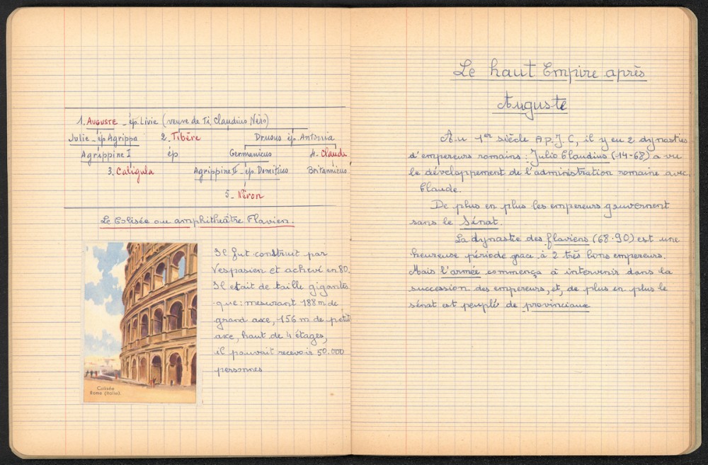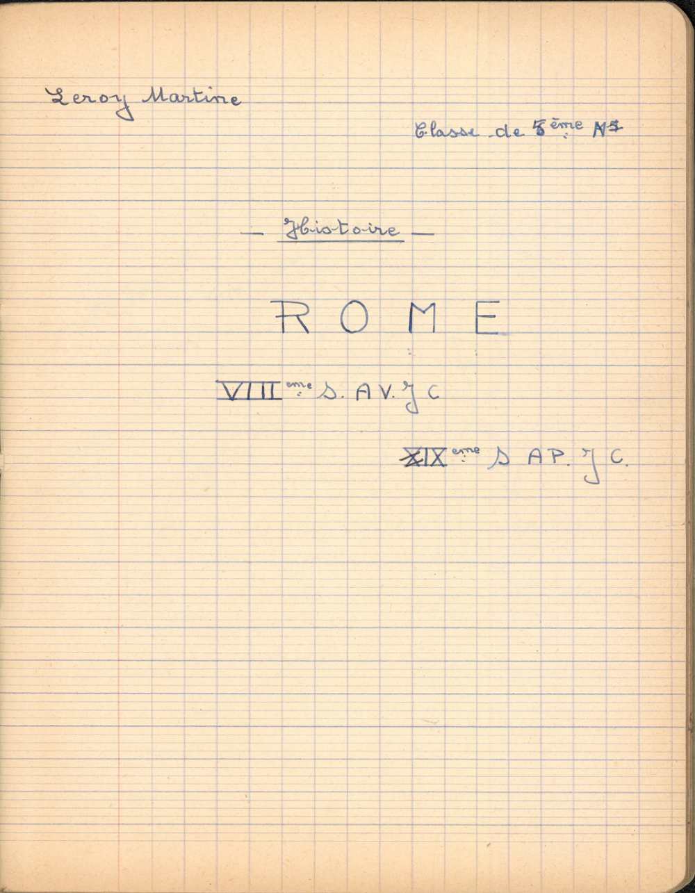 Notes : Cahier d'Histoire de Martine Leroy-Bouveyron (née Leroy) alors âgée de 12 ans, élève de 5e M1, au Lycée Victor Duruy à Paris (VIIe arrondissement), durant l'année 1959-1960.
