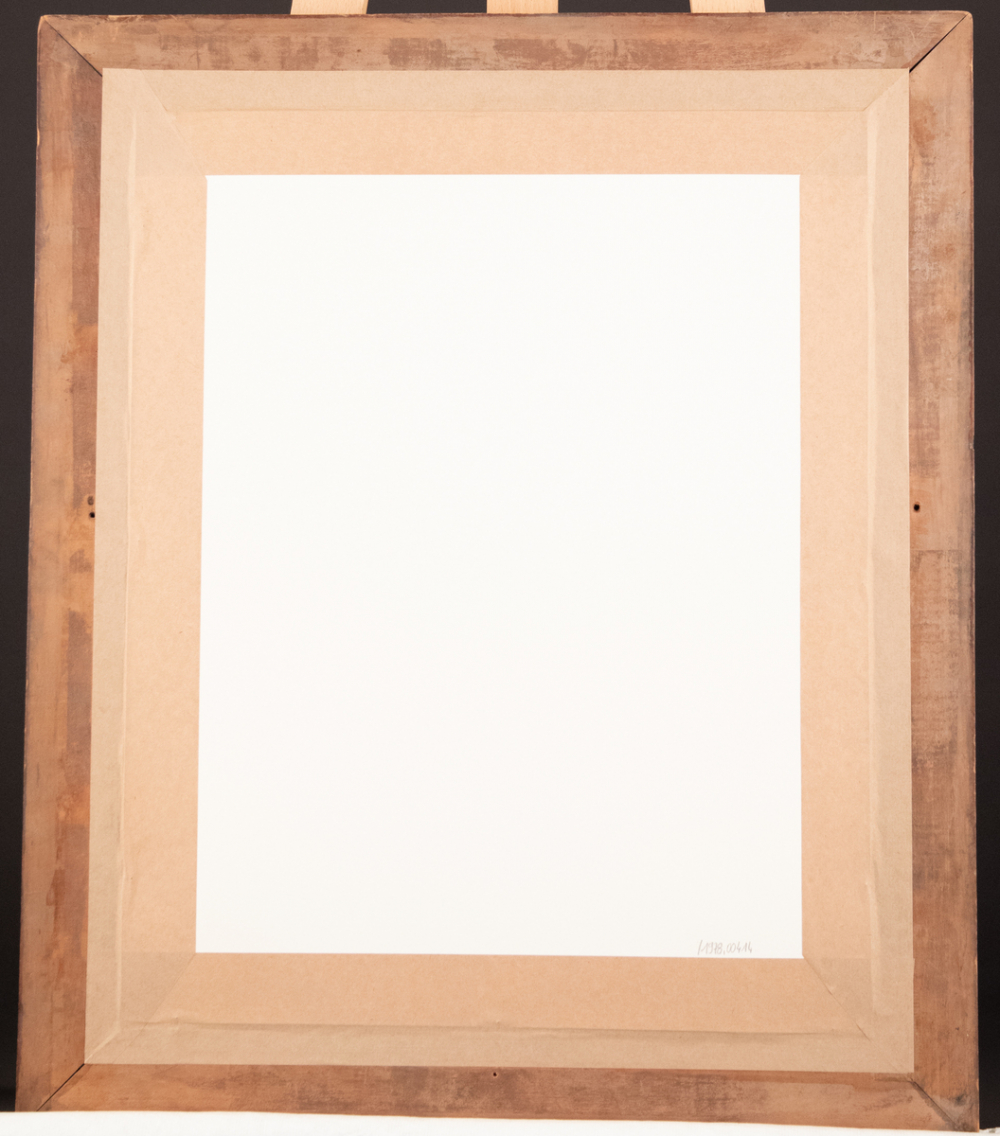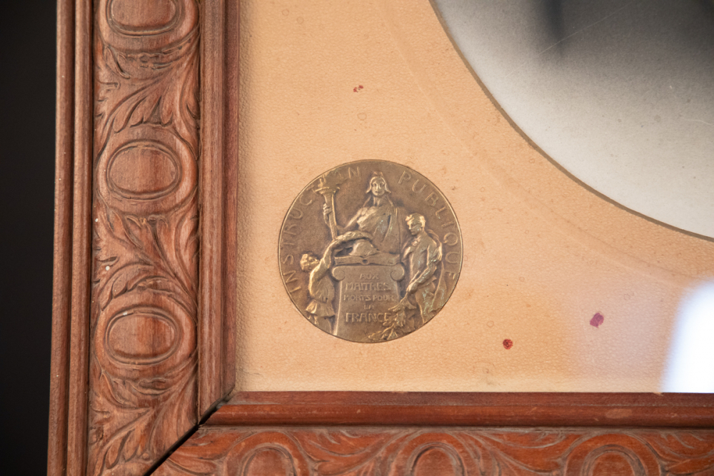 Description : Cadre photographique rectangulaire en bois sculpté de branches d'olivier, avec ouverture ovale et verre ancien. Contient une photographie signée, montée sur un passe-partout à ouverture ovale de couleur beige granité. L'ensemble est associé à une médaille commémorative. Une étiquette est placée à senestre, portant des mentions manuscrites. Le dos, en carton, présente des annotations.