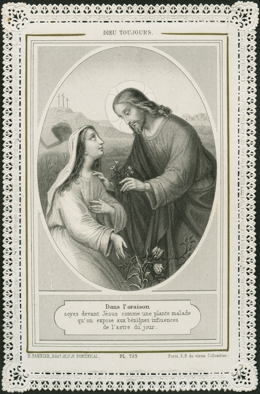 Notes : Gravure intitulée "Dieu toujours" avec mention imprimée dans le cartouche inférieur "Dans l'oraison. Soyez devant Jésus comme une plante malade qu'on expose aux bénignes influences de l'astre du jour."