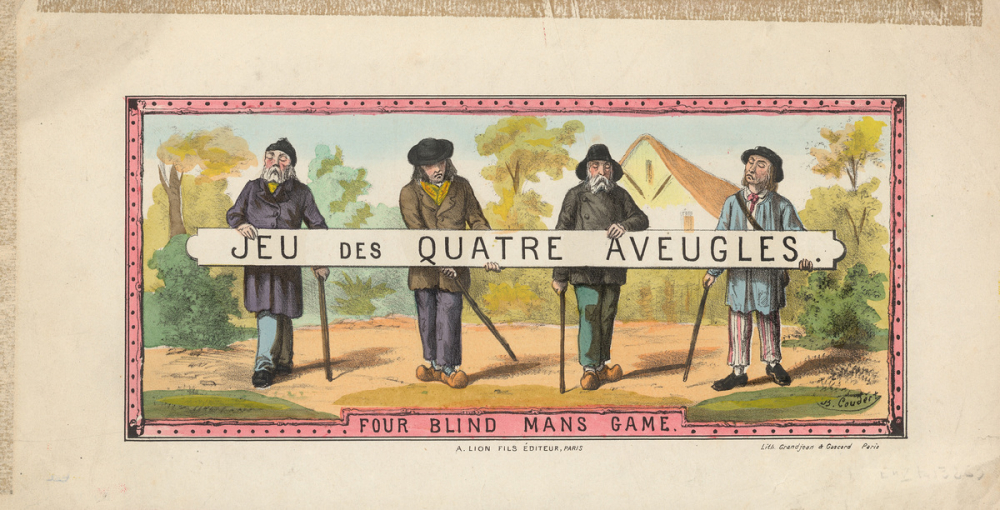 Cette lithographie décorait le couvercle d'une boîte de jeu, les quatre aveugles.