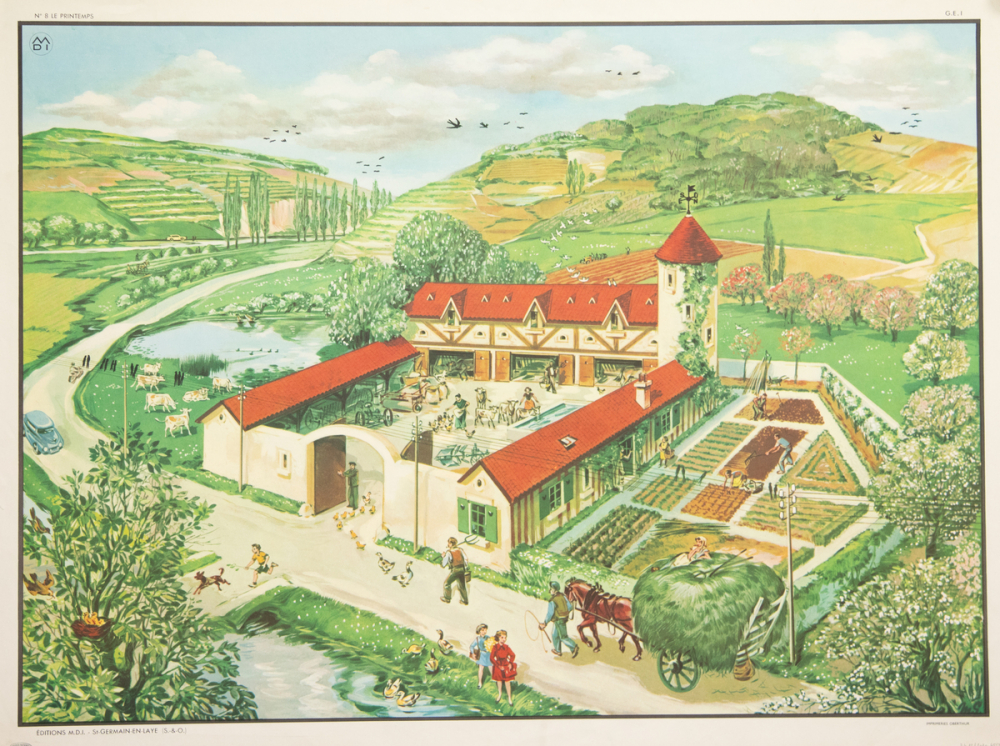 Verso : vue en plongée d'une ferme composée de bâtiments entourant une cour, avec une tourelle surmontée d'une girouette. A droite un enclos potager, à gauche un étang. Au premier plan, une rivière et une route, à l'arrière plan, un paysage de collines couvertes de prés et de champs. La scène se déroule au printemps : arbres en feuilles, activités agricoles en rapport (transport de foin, labour, potager planté...), arbres fruitiers en fleurs, enfants jouant... Dans la cour de la ferme, des vaches et du matériel agricole visible.