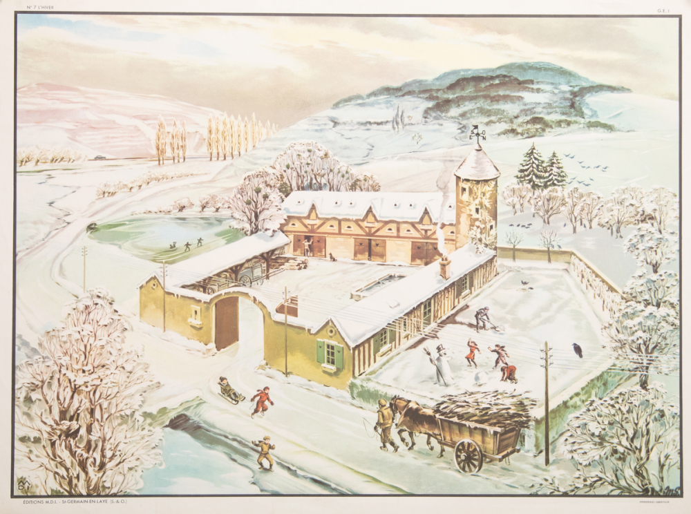 Représentations : hiver, printemps, cour de ferme / Recto : vue en plongée d'une ferme composée de bâtiments entourant une cour, avec une tourelle surmontée d'une girouette. A droite un enclos potager, à gauche un étang. Au premier plan, une rivière et une route, à l'arrière plan, un paysage de collines couvertes de prés et de champs. La scène se déroule en hiver : paysage enneigé, rivière et étang gelés, enfants qui font un bonhomme de neige, pas d'activité agricole visible.