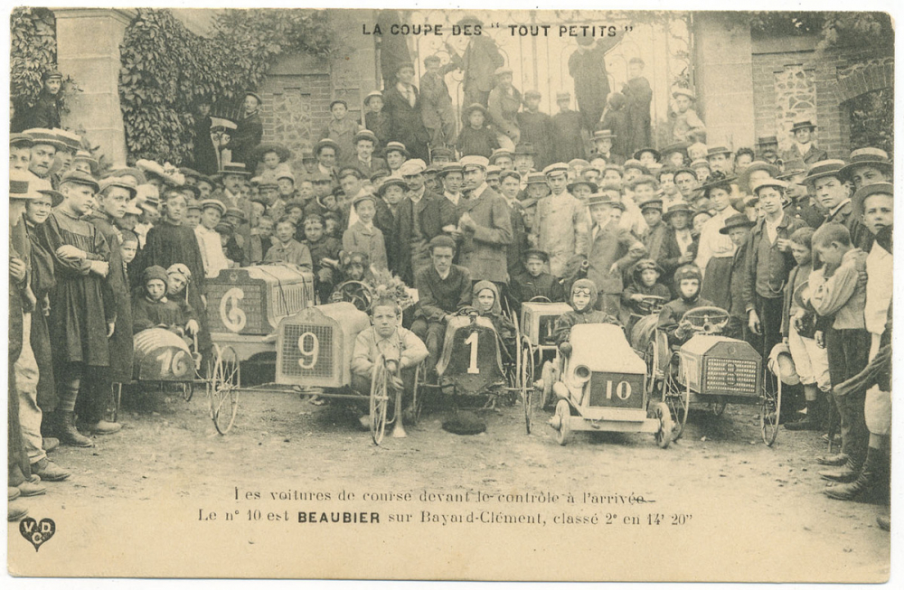 La Coupe des Tout Petits. Les voitures de course devant le contrôle à l'arrivée. Le n° 10 est Beaubier sur Bayard-Clément, classé 2e en 14' 20''.