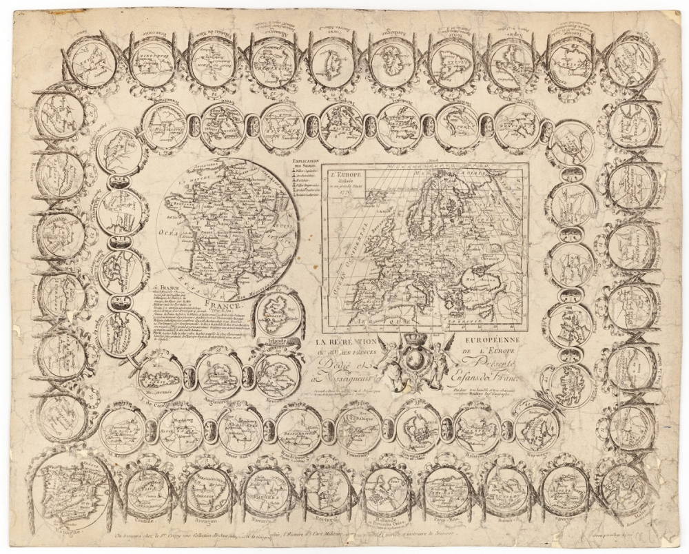 Représentations : jeu, carte géographique, France, Europe / Plateau de jeu de l'oie en forme de spirale antihoraire de 61 cartouches légendés et numérotées, encadrant une carte d'Europe, et traçant un tour du continent qui débute en Espagne et s'achève en France.