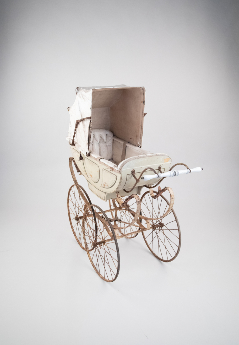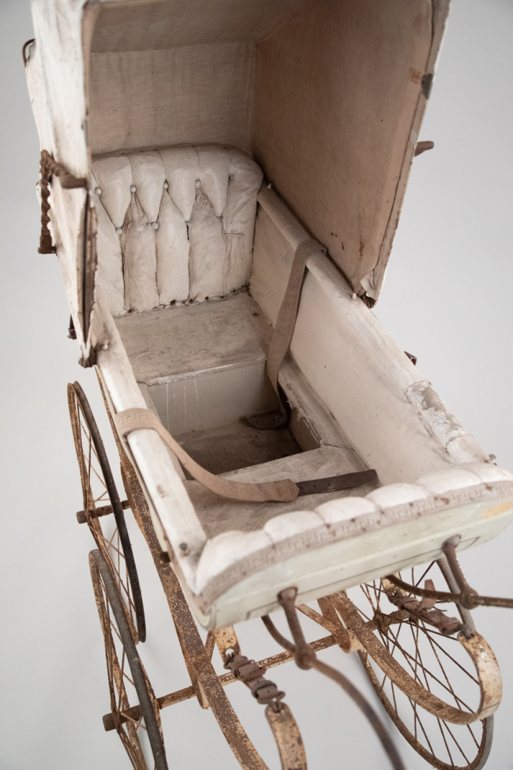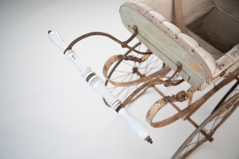 Description : Caisse en bois en relief et peinte de couleur blanche avec liseré vert entourant les reliefs, l' intérieur est en toile enduite de couleur blanche, présence d'un creux centrale, deux sièges avec sangles, repose-tête capitonnés. Capote deux plis avec compas, amovible dans les deux sens, guidon en métal avec poignée en céramique blanche, quatre roues à rayons dont deux sans pneus, châssis en métal travaillé en arrondi avec suspensions en cuir, enfant face à soi