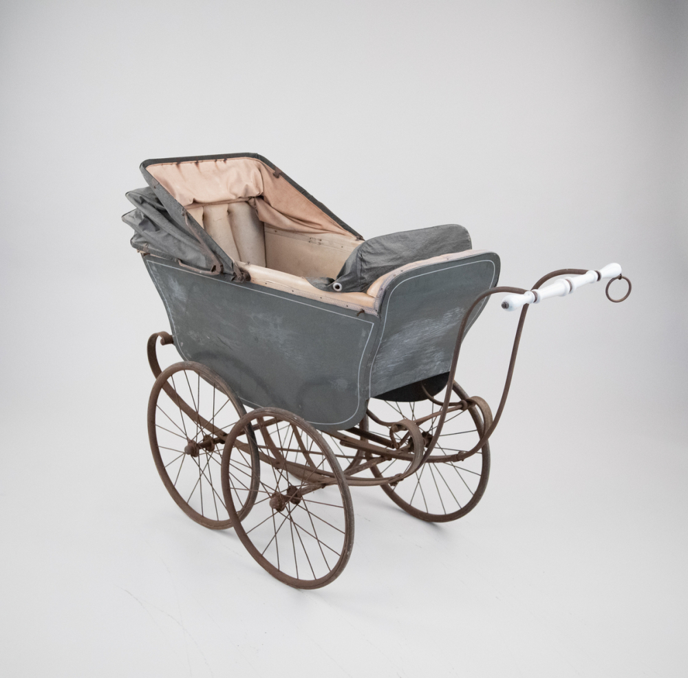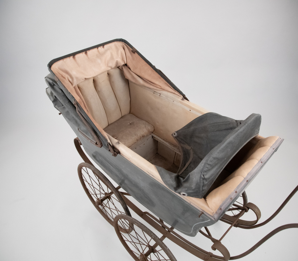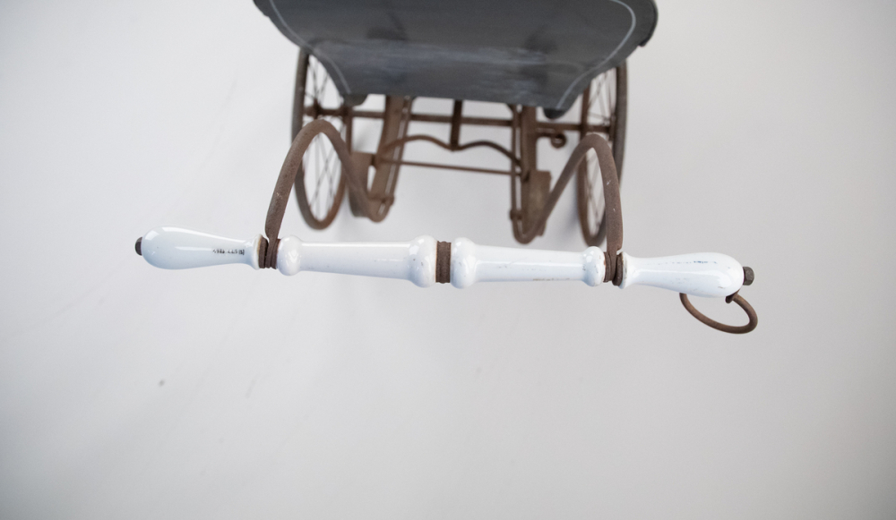 Description : Caisse en bois grise, poignées en porcelaine, 4 roues en fer avec suspension en fer.