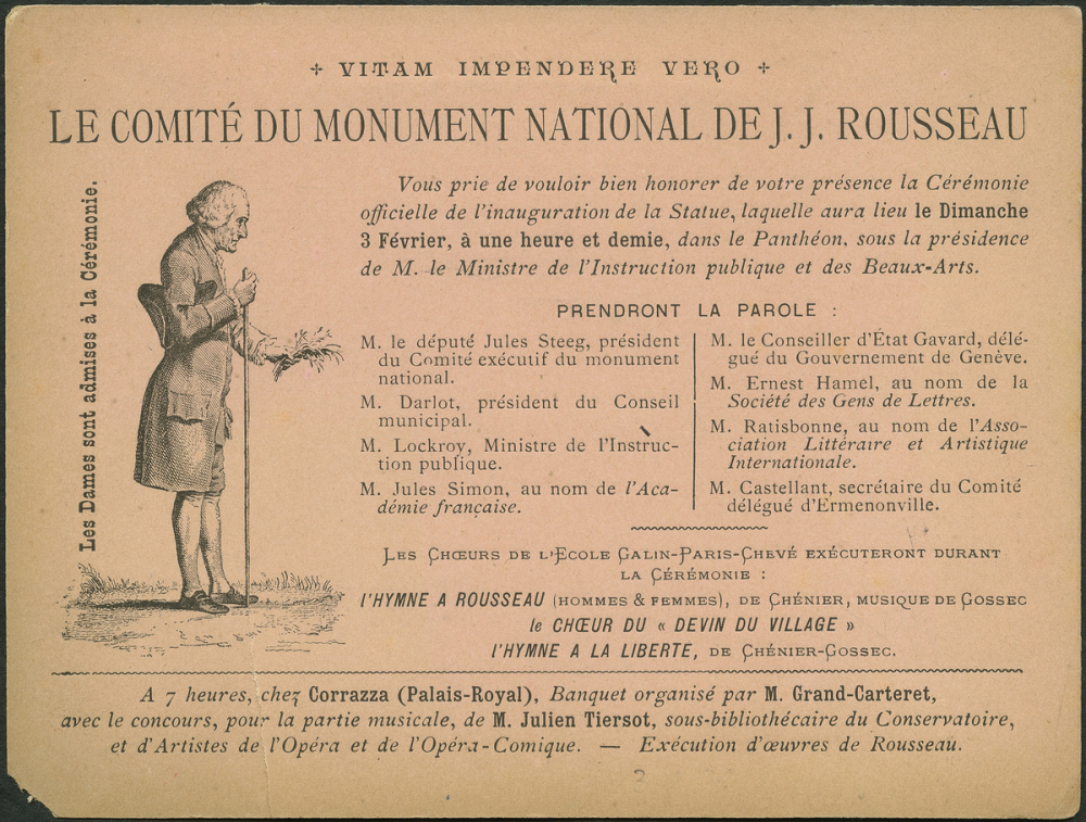 Le Comité du Monument National de J. J. Rousseau. Carton d'invitation.