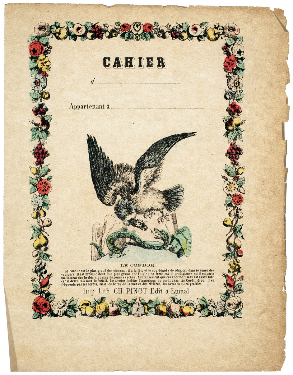 Notes : Recto : gravure en couleurs représentant un condor attaquant un serpent dans un cadre de fruits et fleurs + Texte explicatif de 8 lignes.