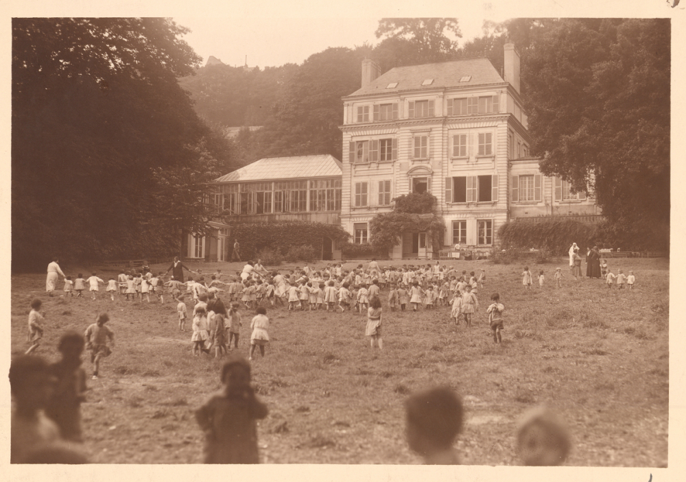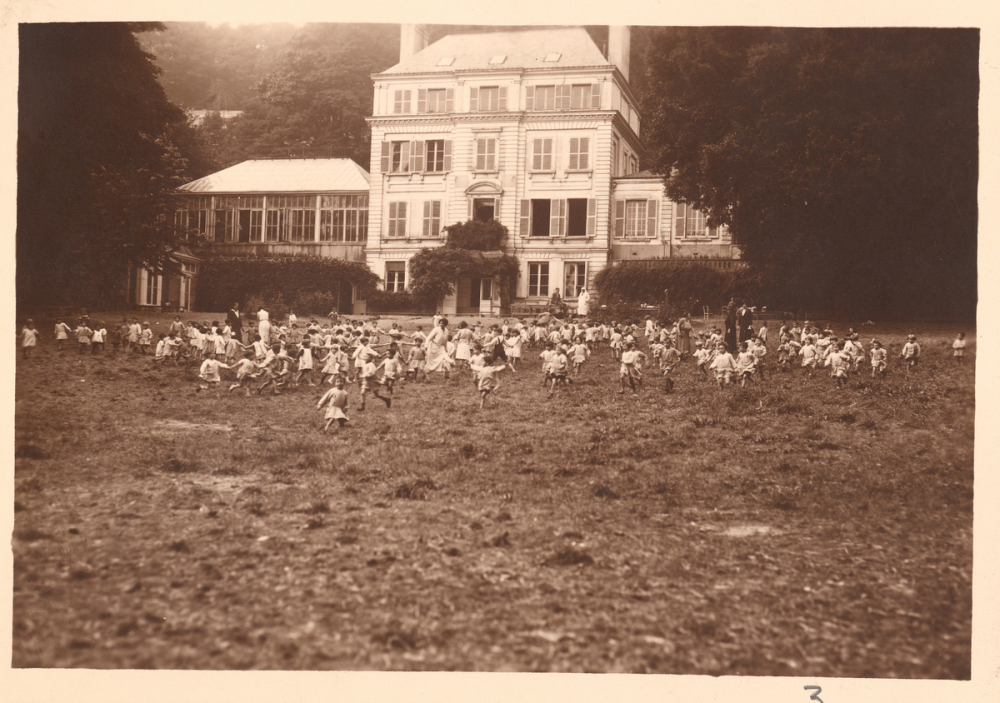 Représentations : scènes : enfant, jeu / Sur la photographie du haut : la scène montre un grand bâtiment à plusieurs niveaux, surmonté d'un toit mansardé. Devant la façade, une vaste pelouse accueille un grand groupe d'enfants. Certains semblent engagés dans des activités physiques ou de jeux de plein air.