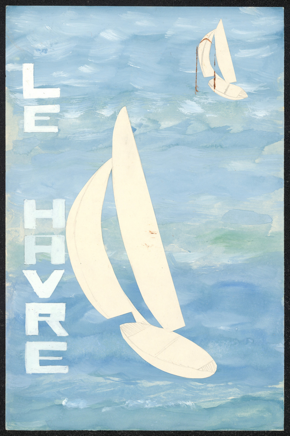 Représentations : bateau à voiles, mer, Le Havre / Plusieurs nuances de bleu, vert, et gris, recouvrent la feuille, représentant la mer. Quelques traits blancs ondulés représentent les vagues. Deux voiliers blancs découpés dans du papier Canson sont collés çà et là sur la mer. Au crayon à papier sont tracés les détails des bateaux. Au bord gauche de la feuille, en grosses lettres blanches se suivant verticalement, est écrit "Le Havre".