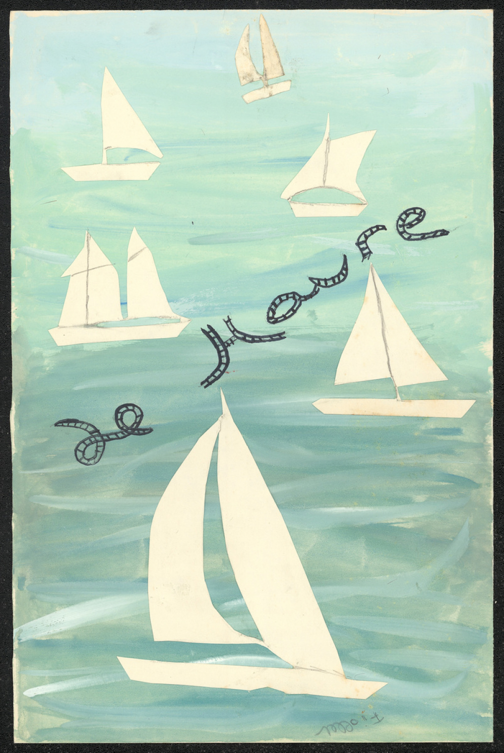 Représentations : bateau à voiles, mer, Le Havre / Plusieurs nuances de bleu, vert, blanc, et gris, recouvrent la feuille, représentant la mer. Six voiliers blancs découpés dans du papier Canson sont collés çà et là sur la mer. Certains détails des bateaux sont dessinés au crayon à papier. Au milieu de la feuille, en grosses lettres tracées au feutre noir, est écrit "Le Havre".