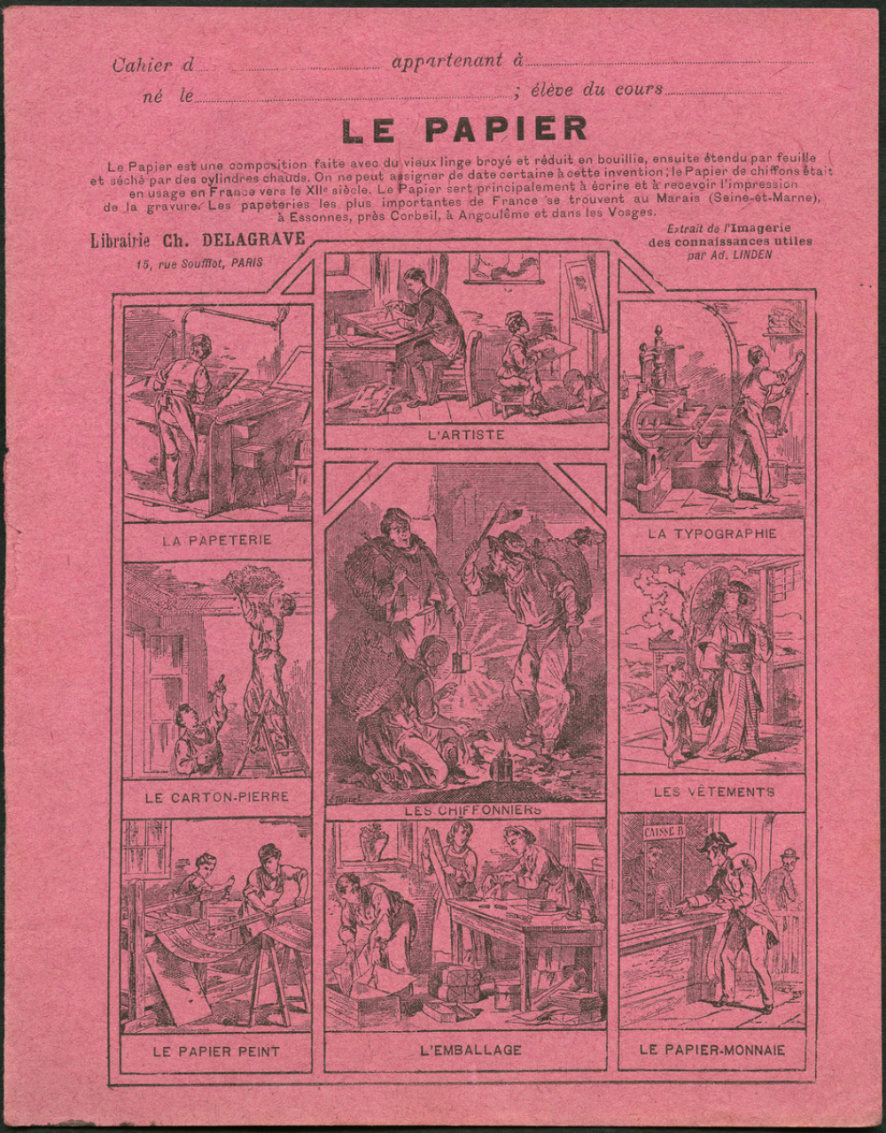 Notes : Recto: 9 vignettes légendées (papeterie - carton-pierre - papier-peint - artiste - chiffonniers - emballage - typographie - vêtements - papier-monnaie). "Extrait de l'Imagerie des connaissances utiles, par Ad. Linden" [publié chez Delagrave en 1877 > voir inv. BNF].