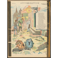 Notes : Illustration de la fable de La Fontaine : "Le Pot de Terre et le Pot de Fer" encadrant le texte imprimé.