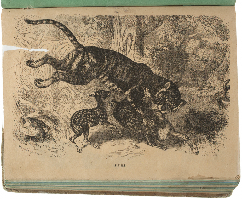 Verso: texte anonyme sur "Le tigre". "Figures extraites de "La vie des animaux", par Brehm".