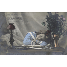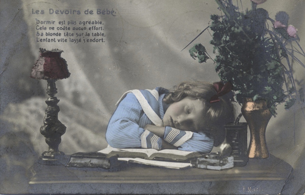 "Dormir est plus agréable, / Cela ne coûte aucun effort. / Sa tête blonde sur la table, L'enfant vite lassé s'endort."