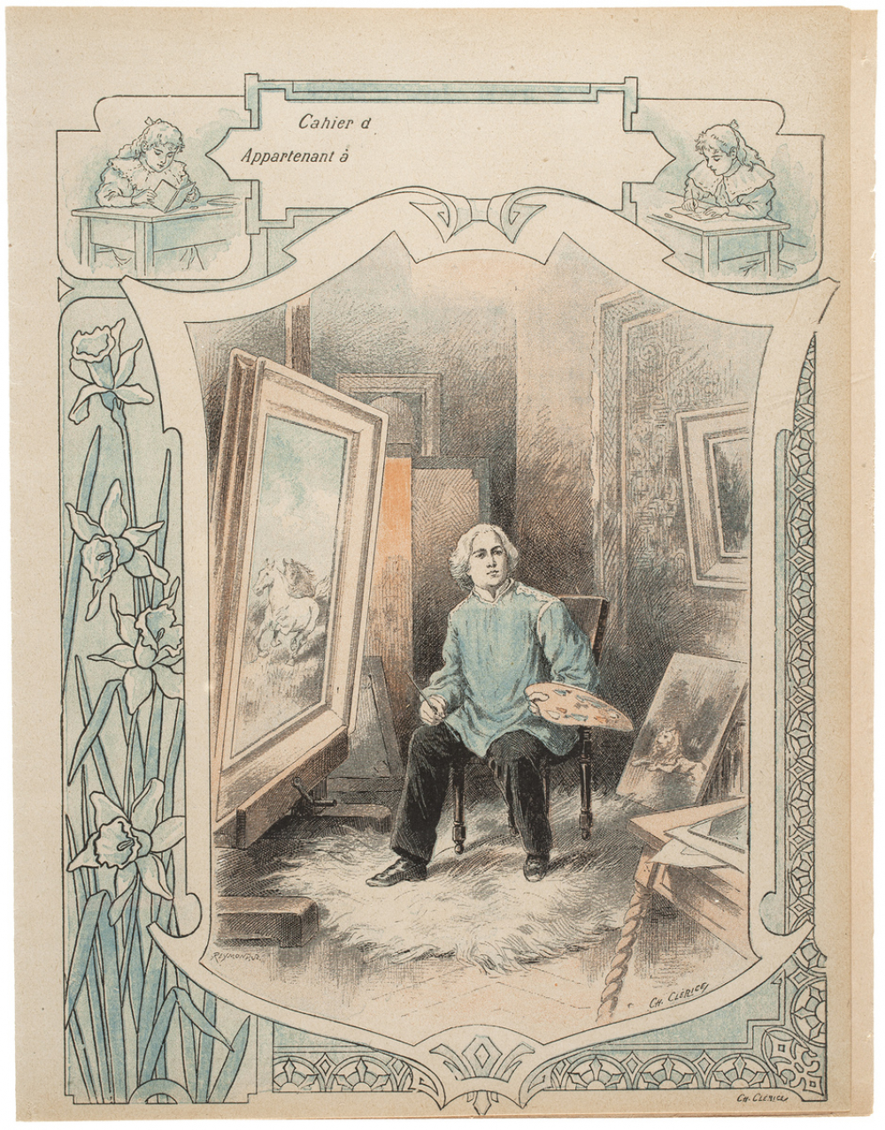 Description : Papier blanc épais jauni. Chromolithographie dans un cadre décoratif floral (style Art Nouveau) en camaïeu bleu-gris + 2 vignettes encadrant le cartouche-étiquette en haut représentant une petite fille lisant et écrivant. Texte au verso avec cadre décoratif plus simple bleu-gris.