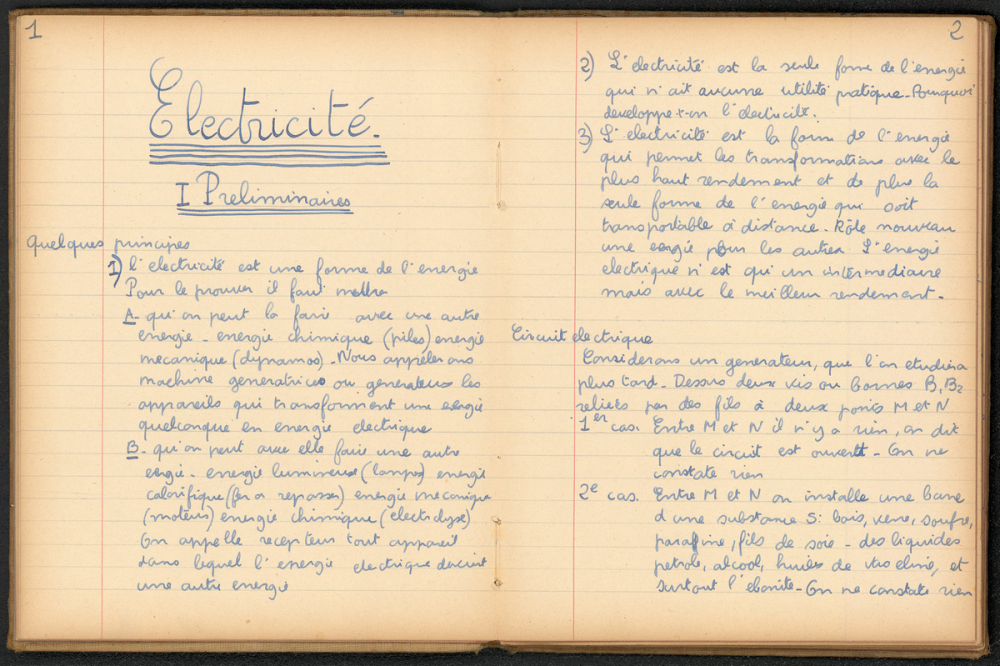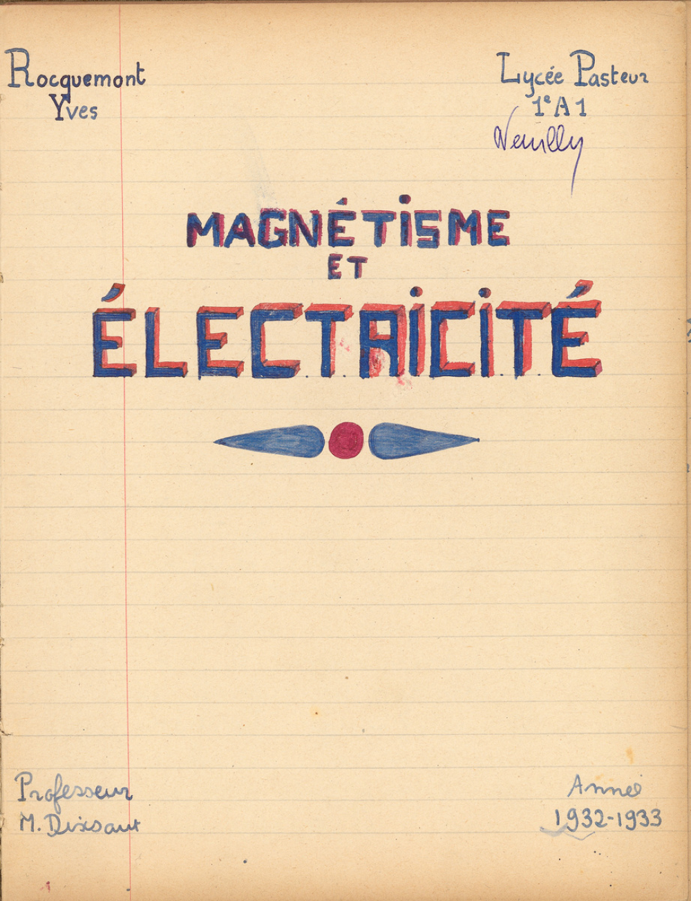 Notes : Il s'agit du cahier de Sciences-Physiques (magnétisme et électricité) d'Yves Rocquemont, élève du professeur Dixsaut, scolarisé au Lycée Pasteur de Neuilly-sur-Seine en classe de 1ère A1, durant l'année 1932-1933.