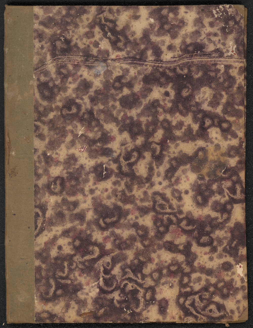 Description : Couverture cartonnée à motif marbré. Dos toilé kaki. Reliure cousue. Absence de réglure.