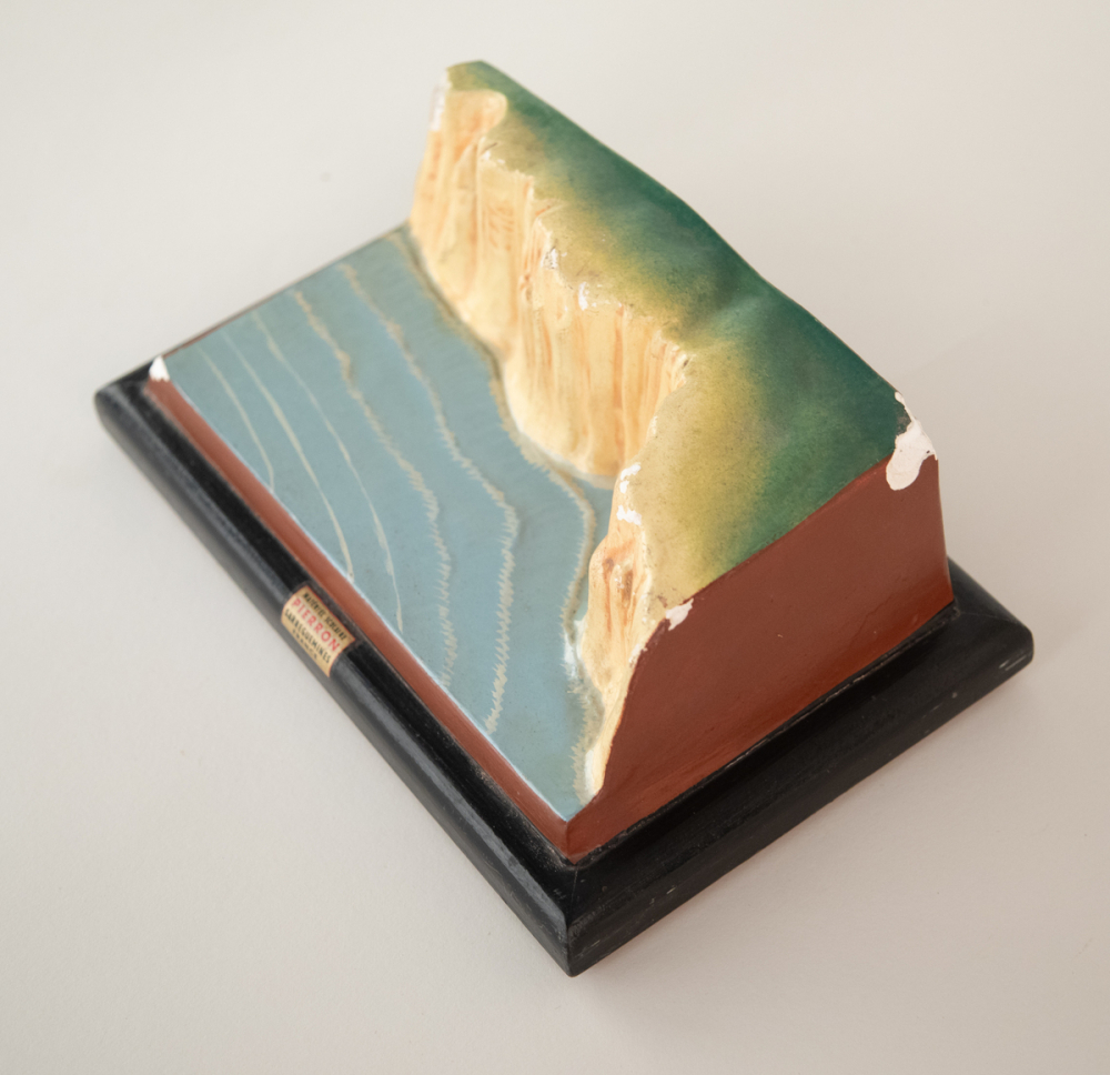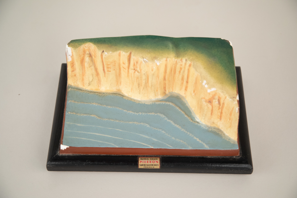 Représentations : bord de mer, falaise / Modèle en relief (ou bloc-diagramme) peint, représentant une portion de littoral à falaise calcaire, surmontée d'un plateau en herbe ; au premier plan, la mer dont les vagues viennent jusqu'au pied de la falaise.