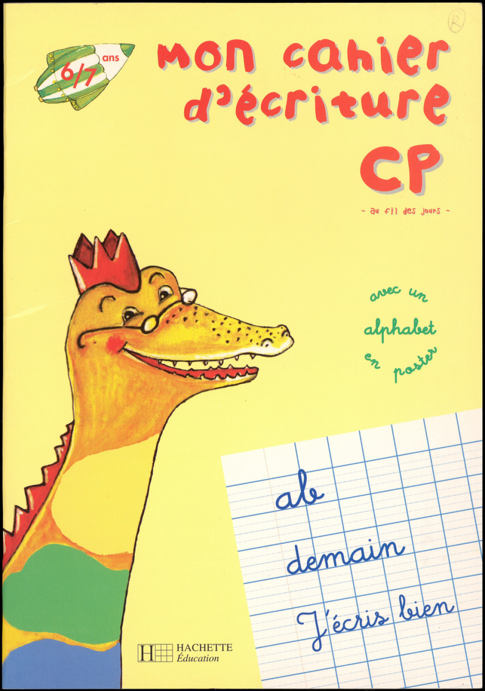 Description : Cahier agrafé, couverture cartonnée jaune pelliculée, 1ère de couverture illustrée en couleur avec en haut en rouge le titre, en haut à gauche le dessin d'une fusée sur laquelle est inscrit "6/7 ans", dans la moitié inférieure gauche est dessinée un dragon portant une couronne et des lunettes, à droite imprimé en vert "avec un alphabet en poster", en dessous est reproduit une feuille de réglure seyes avec des mots écrits en bleu, en bas logotype de l'éditeur. 4ème de couverture avec la même fusée en haut à gauche, en dessous "dans la même collection" en rouge, et une présentation de la collection "au fil des jours", une étiquette de prix collée en bas. Page de titre, page de présentation, sommaire. Les pages blanches présentent un bandeau orange avec une vignette ronde ou ovale contenant un dessin bleu d'animal, modèles de lettres ou de mots en bleu, consignes imprimées en orange, différentes hauteurs de lignage, en bas de page un bandeau de réglure seyes. Au centre du cahier un alphabet dans les tons blanc, bleu et orange et des images reprenant celles du cahier. 3ème de couverture avec une publicité pour un dictionnaire.