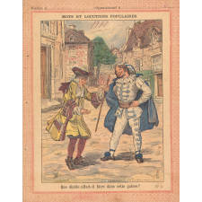 Notes : Couverture de cahier faisant partie d'une série intitulée "Mots et locutions populaires" produite par la maison d'édition parisienne Gédalge. Cette couverture porte le n° 3. Texte anonyme au dos, qui explique l'origine de l'expression "Que diable allait-il faire dans cette galère ?" A l'intérieur de la couverture, écriture manuscrite au crayon bleu du professeur : "Vu : Marius pourrait mieux faire", suivi de la signature.