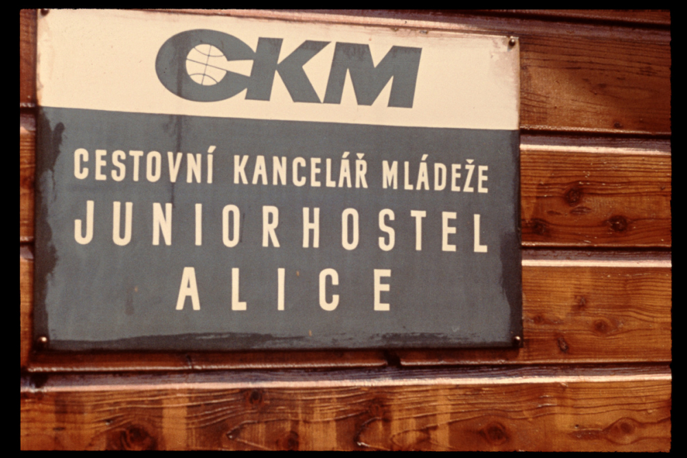 Représentations : représentation d'objet : auberge / Un panneau de la CKM (Cestovní kancelář mládeže) indiquant une auberge de jeunesse est visible. Il est de couleur bleue et blanche et fixé sur une structure en bois.