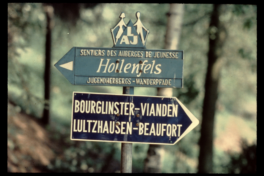 Représentations : représentation d'objet : auberge / Deux panneaux sont visibles. L'un indique les sentiers des auberges de jeunesse, en français et en allemand, à Hollenfels. L'autre mentionne Bourglinster, Vianden, Lultzhausen et Beaufort. Au-dessus des panneaux se trouve un triangle portant les lettres « LAJ ».