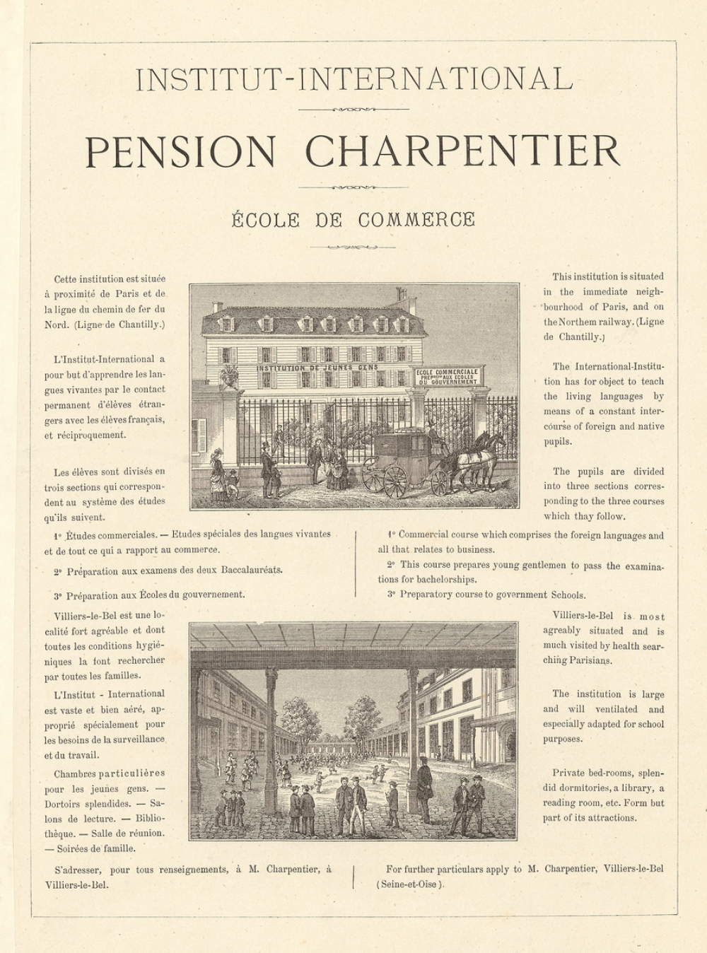 Présentation sur 2 colonnes (en français à g. et en anglais à dr.) de la Pension Charpentier qui prépare des jeunes gens aux études commerciales et aux différents baccalauréats en mettant l'accent sur l'enseign. des langues.