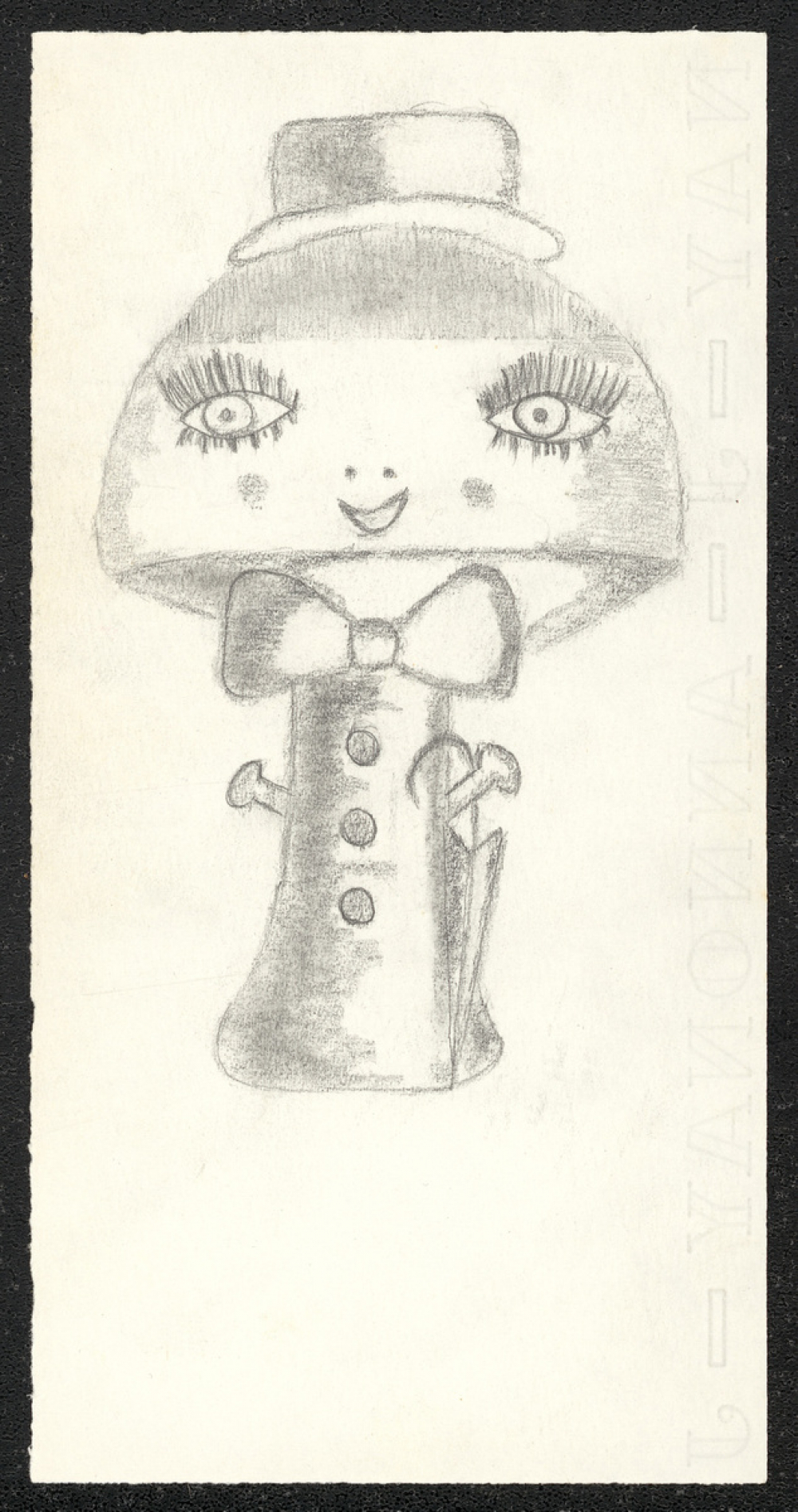 Représentations : femme imaginaire / Représentation d'une femme ayant la forme d'un champignon, et ayant des grands yeux, des longs cils, une petite bouche et des petits bras. Elle porte un chapeau, un nœud papillon, des boutons, et un parapluie. Le coloriage partiel permet un jeu d'ombrage.