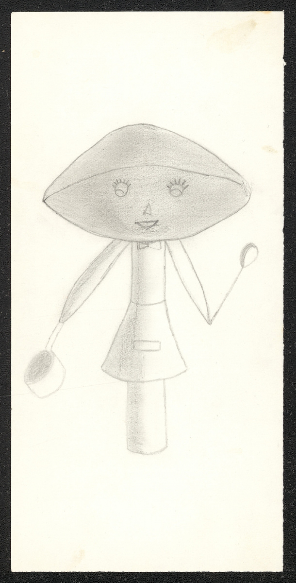 Représentations : femme imaginaire / Représentation d'une femme ayant un corps cylindrique et une tête elliptique, portant une jupe, un nœud papillon, et tenant une casserole dans sa main droite et une cuillère dans la main gauche.