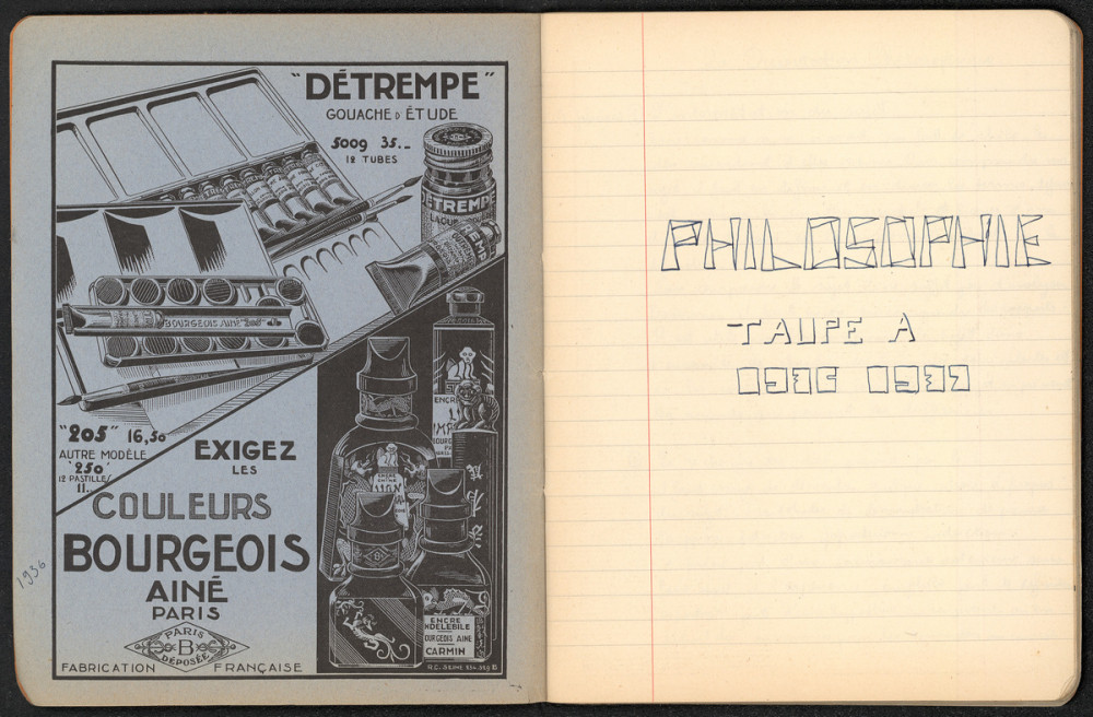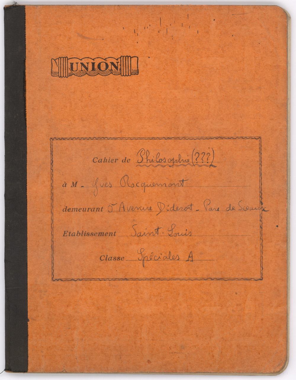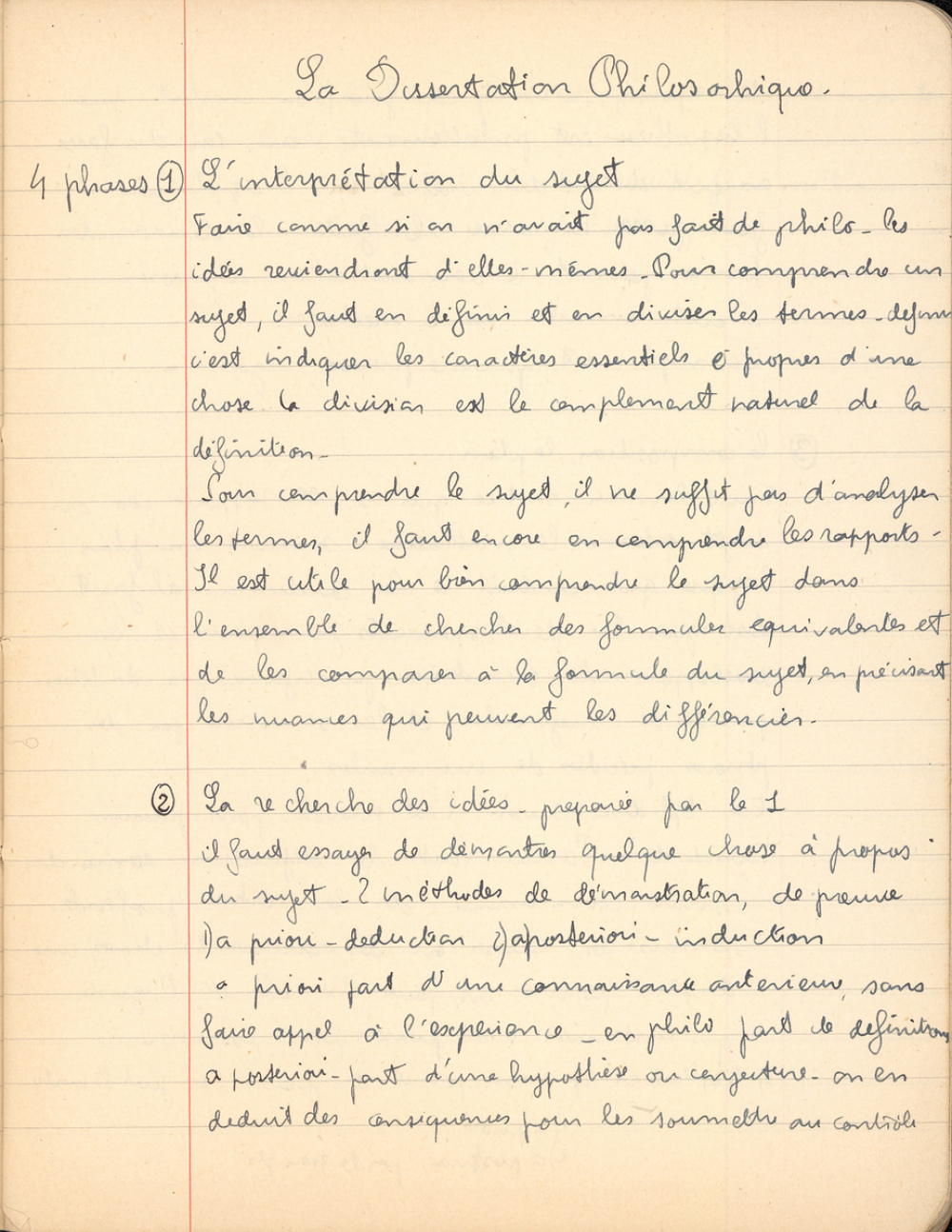 Notes : Il s'agit du cahier de Philosophie d'Yves Rocquemont, élève scolarisé en classe préparatoire de l'Ecole Polytechnique en Spéciales A dite taupe (en 5/2, redoublant de 2e année), au Lycée Saint-Louis de Paris (6e arrondissement), durant l'année 1936-1937.
