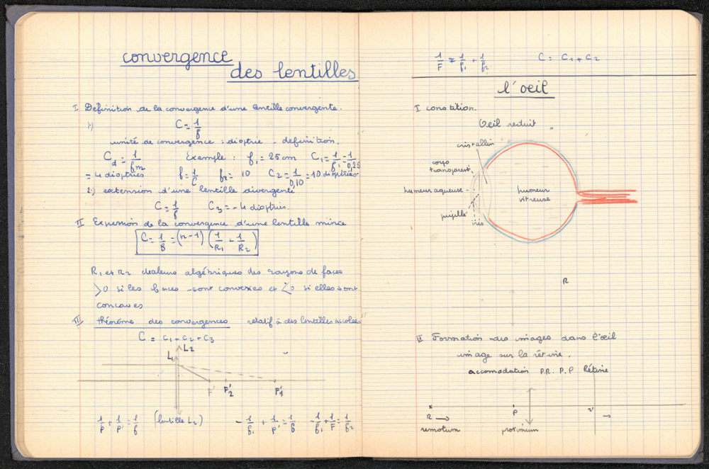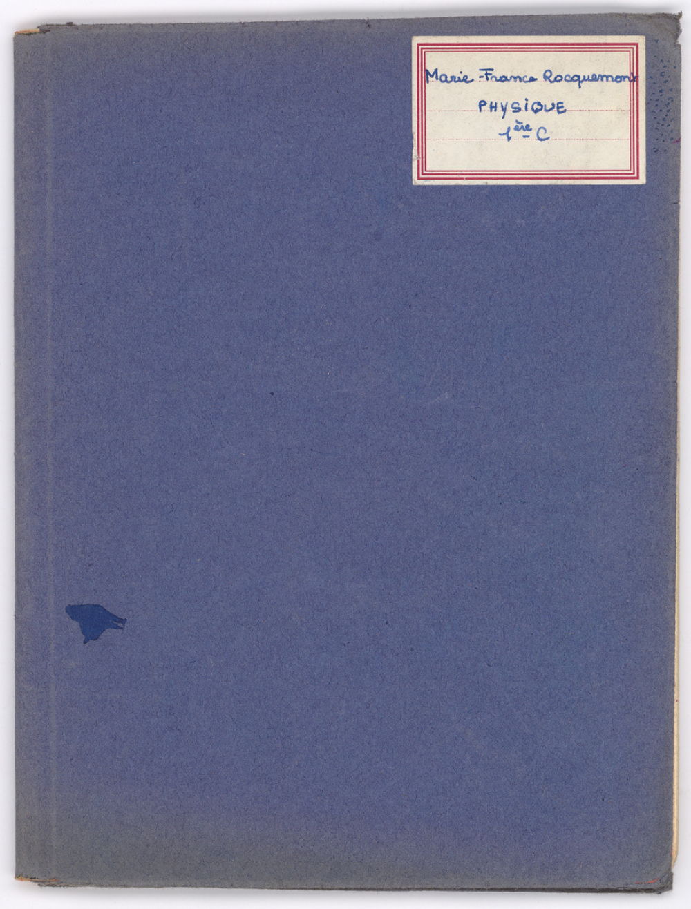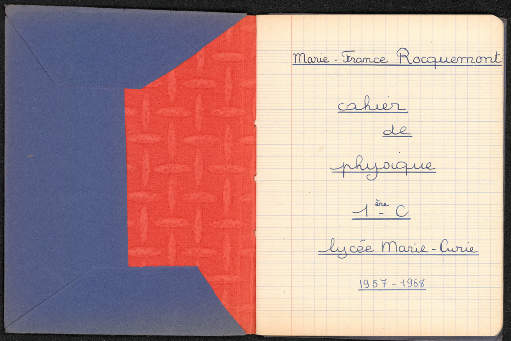 Notes : Il s'agit du cahier de Physique de Marie-France Rocquemont (épouse Morel), élève alors scolarisée au lycée Marie Curie de Sceaux (Hauts de Seine, ex-Seine) en classe de 1ère C, durant l'année 1957-1958.