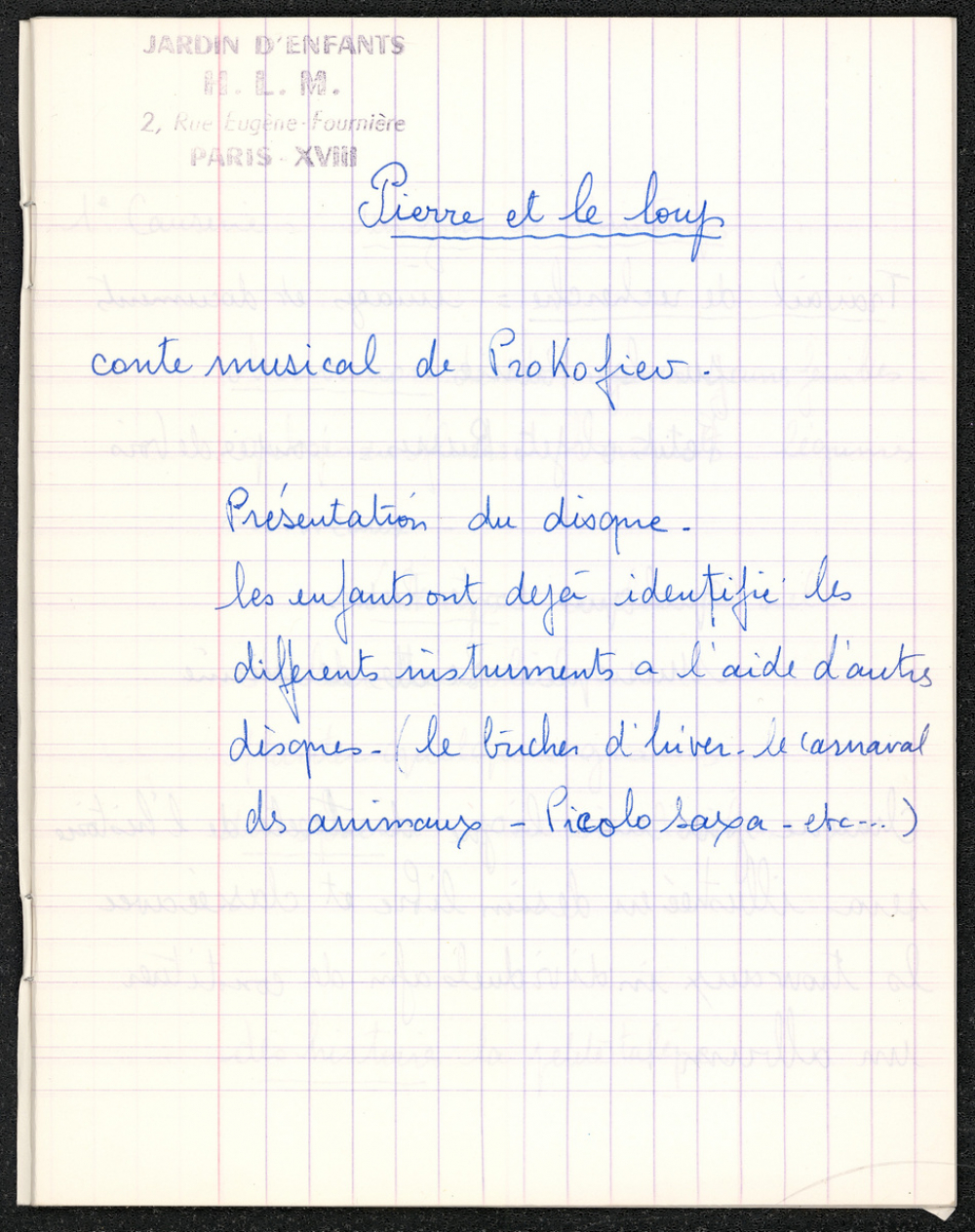 Notes : Il s'agit d'un cahier de préparation de cours d'une enseignante du Jardin d'enfants H.L.M., situé au 02, rue Fournière (désormais au n° 20) à Paris dans le XVIIIe arrondissement, dépendant donc de l'accompagnement municipal des OPHLM de l'EJE (éducateur de jeunes enfants) de La Ville de Paris.