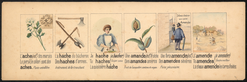 Représentations : amande, hache, ache / Les vignettes illustrent dans l'ordre suivant : l'ache des marais ; la hache du bûcheron ; je hache ; une amande fraiche ; une forte amende ; j'amende.