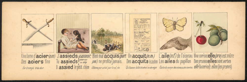 Historique : Planche réalisée par Gustave (dit Jules) Bonnerot, instituteur à Saint-Brancher puis Athie (Yonne), pour apprendre à ses élèves les différents cas d'homonymie. Cette pièce fait partie d'un lot de 103 planches. En 1973-1974, elles furent exposées pendant six mois dans la Maison du Coche d'Eau à Auxerre.
