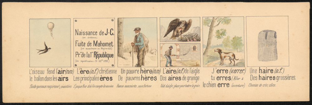 Planche illustrée pour apprendre l'homonymie : air / ère / hère / aire / erre / haire