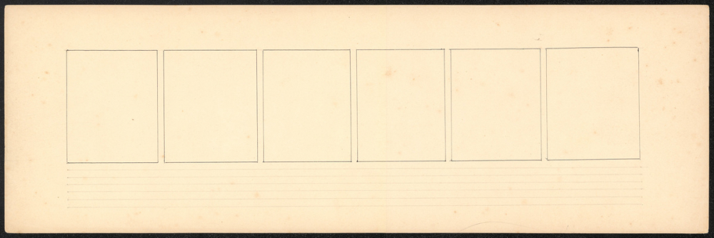 Description : Planche sur papier produit par l'ancienne manufacture Canson & Montgolfier Vidalon-les-Annonay, de qualité B soit une épaisseur adaptée au crayon, aux études ou aux croquis. Format paysage, comprenant 6 vignettes préparées à l'encre. Six lignées tracées au crayon papier sont situées sous les vignettes.