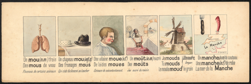 Planche illustrée pour apprendre l'homonymie : mou / moue / moût / mouds, manche / Manche